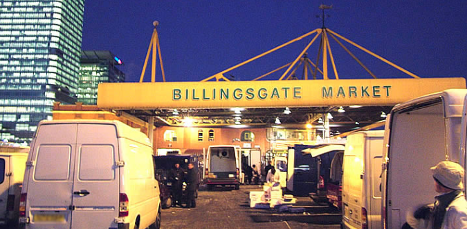 「Billingsgate Market 倫敦海鮮市場」本來位於倫敦塔橋不遠處、泰晤士河的倫敦中心河段,後來才搬到Poplar與Canary Wharf之間,直到現在。